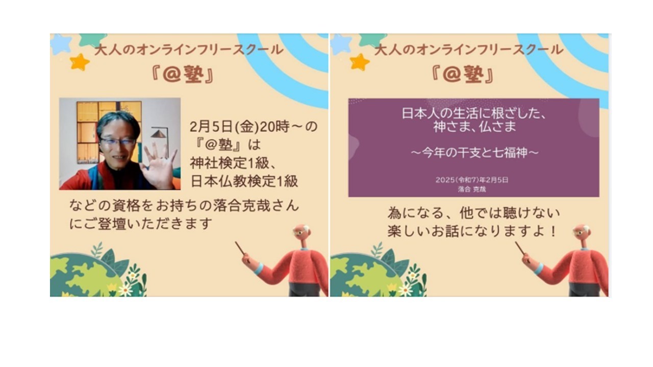 Tさんは、長年オンラインでのフリースクールを主宰され、毎月のように勉強会を実施している方です。あるとき、弊社代表の落合に、ゲストスピーカーとして東洋に関するテーマで何か話して欲しいと依頼がありました。実施時期が2月だったため、暦、干支に関するあれこれと、七福神の解説を行いました。